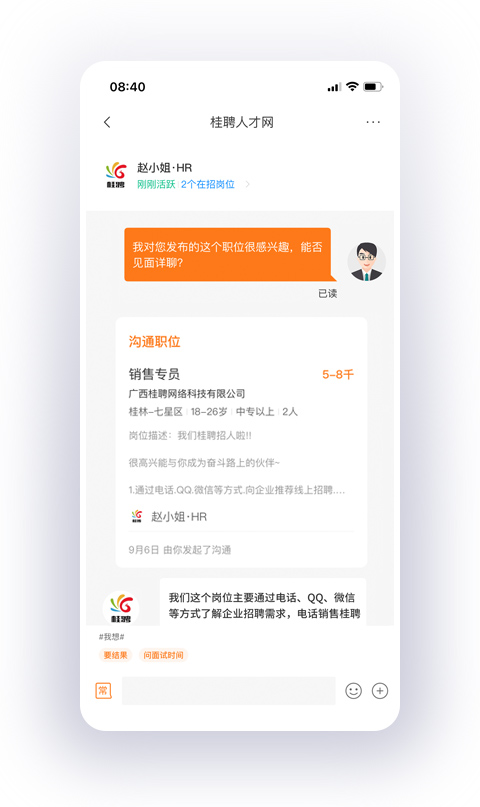 內(nèi)置豐富的求職常用語,輕松掌握,簡單點擊,隨時隨地與HR溝通高效了解自己想要的招聘信息